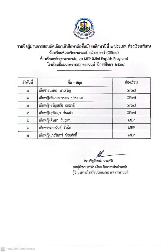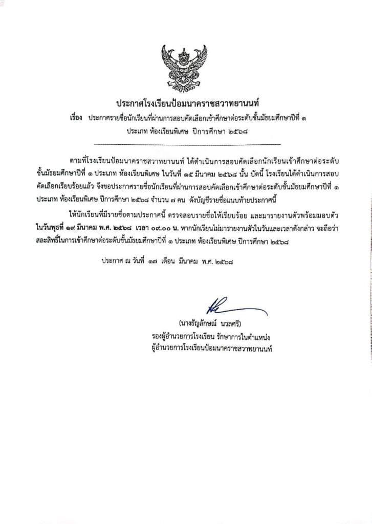 ประกาศโรงเรียนป้อมนาคราชสวาทยานนท์ เรื่อง รายชื่อนักเรียนที่ผ่านการสอบคัดเลือกเข้าศึกษาต่อระดับชั้นมัธยมศึกษาปีที่ 1 ประเภทห้องเรียนพิเศษ ปีการศึกษา 2568