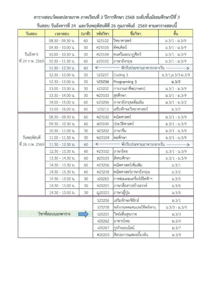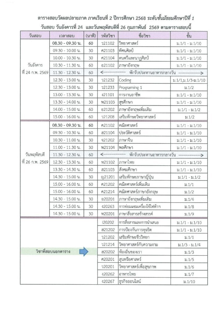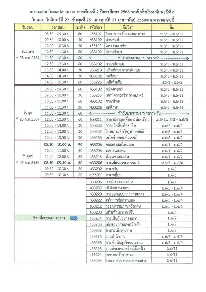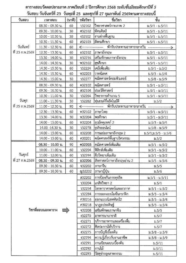 ตารางสอบปลายภาคเรียนที่ 2/2568